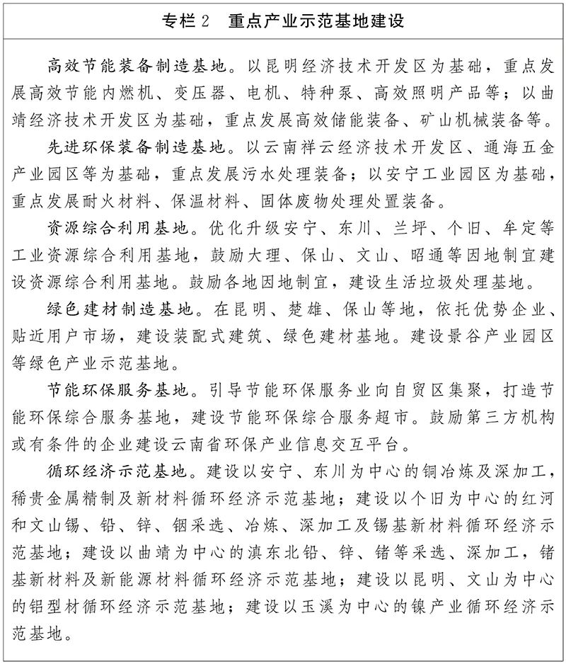 2.特色優(yōu)勢(shì)領(lǐng)域整體提升。以減污降碳為抓手,著力打造5條競(jìng)爭(zhēng)力強(qiáng)的特色優(yōu)勢(shì)產(chǎn)業(yè)鏈,建設(shè)一批集聚度高、優(yōu)勢(shì)特征明顯的環(huán)保產(chǎn)業(yè)示范基地和特色產(chǎn)業(yè)園,在稀貴金屬及有色金屬回收利用、節(jié)能環(huán)保裝備制造、九大高原湖泊和重點(diǎn)流域水環(huán)境保護(hù)治理、硅鋁磷產(chǎn)業(yè)廢氣資源化及溫室氣體協(xié)同減排、土壤污染治理和生態(tài)修復(fù)、大宗固體廢物綜合利用等方面培育一批帶動(dòng)力強(qiáng)的龍頭企業(yè)、“專精特新”企業(yè),實(shí)施一批示范工程,推動(dòng)形成契合我省綠色低碳發(fā)展的現(xiàn)代環(huán)保產(chǎn)業(yè)體系。