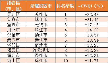 地表水環(huán)境質(zhì)量改善幅度相對較快的前10位(1—10名)依次是:吳江區(qū)、句容市、宜興市、丹陽市、儀征市、泰興市、沭陽縣、灌云縣、靖江市、銅山區(qū);