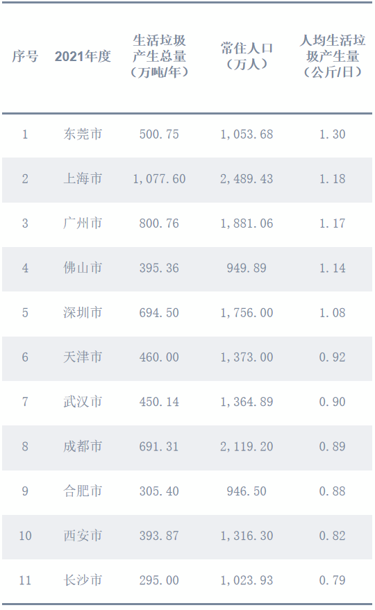 2021年度,11個重點城市中,人均生活垃圾產生量最高的城市是東莞市,人均每日產生生活垃圾1.30公斤;人均生活垃圾產生量最低的城市是長沙市,人均每日產生生活垃圾0.79公斤。