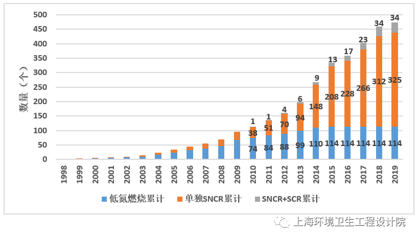 圖1 生活垃圾焚燒廠煙氣配置情況逐年統(tǒng)計(jì)圖