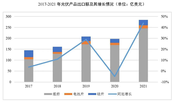 2021年我國光伏產(chǎn)品出口總額約284.3億美元,同比增長(zhǎng)43.9%。其中硅片出口額24.5億美元,出口量約22.6GW,電池片出口額13.7億美元,出口量約10.3GW。在全球能源轉(zhuǎn)型、綠色低碳轉(zhuǎn)型大勢(shì)所趨,海外光伏市場(chǎng)需求不斷增長(zhǎng)的大背景下,組件出口額246.1億美元,同比增長(zhǎng)44.8%,出口量約98.5GW,同比增長(zhǎng)25%。組件出口額和出口量均創(chuàng)歷史新高。在多晶硅進(jìn)口方面,2021年我國太陽能級(jí)多晶硅進(jìn)口額約18.7億美元,同比增長(zhǎng)108.2%,進(jìn)口量約11萬噸,同比增長(zhǎng)11.1%。