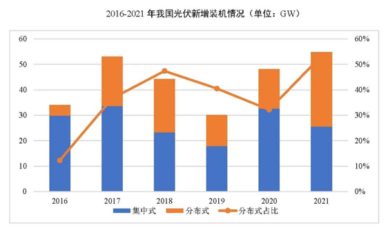 2021年,我國光伏新增裝機(jī)量、分布式裝機(jī)量、戶用裝機(jī)量以及分布式裝機(jī)在總裝機(jī)量中的占比均創(chuàng)歷史新高。我國光伏新增裝機(jī)54.88GW,同比增長(zhǎng)13.9%,其中,分布式裝機(jī)約29.28GW,占全部新增裝機(jī)的53.4%,歷史上首次突破50%。2021年戶用裝機(jī)達(dá)21.6GW,同比增長(zhǎng)113.3%,占2021年我國新增光伏裝機(jī)的39.4%。光伏發(fā)電量3259億千瓦時(shí),同比增長(zhǎng)25.1%,全國利用小時(shí)數(shù)1163小時(shí),同比增加3小時(shí),光伏發(fā)電利用率98%,與上年基本持平,新疆、西藏等地光伏消納水平顯著提升,光伏利用率同比分別提升2.8%和5.6%。