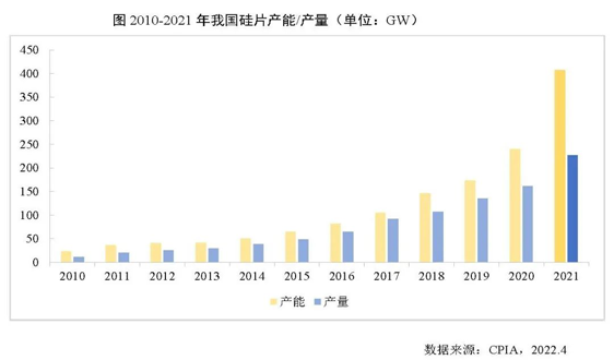 2021年,我國大陸硅片產(chǎn)能約407.2GW,同比增長69.7%;產(chǎn)量約226.6GW,同比增長40.4%,占全球硅片產(chǎn)量的97.3%,在全球硅片領(lǐng)域占據(jù)主導(dǎo)地位。