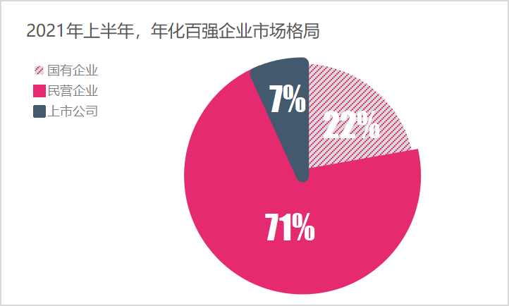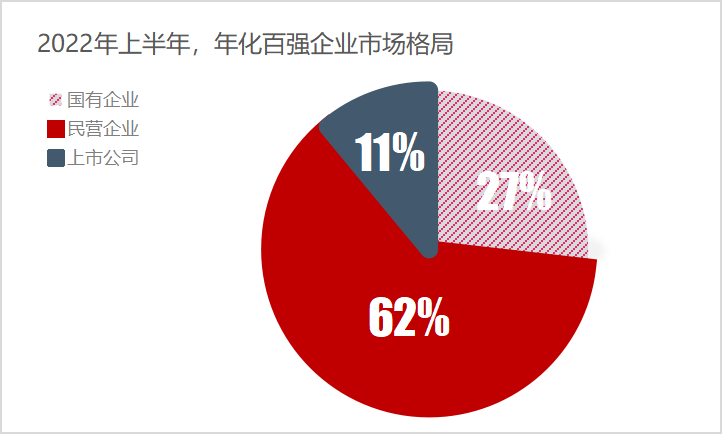 2022年1-5月份,年化額百強(qiáng)企業(yè)中(5個月度的年化百強(qiáng)企業(yè),總數(shù)為500家),國有企業(yè)134家,占比27%;民營企業(yè)311家,占比62%;上市公司55家,占比11%。
