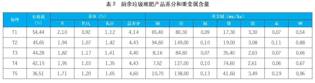 表2為各處理廚余垃圾堆肥產品的有機質、養(yǎng)分和重金屬含量。在堆肥過程中,各處理有機質含量不斷下降,但均滿足《有機肥料》(NY/T 525-2021)標準(有機質含量≥30%)。由于有機物礦化會導致堆體體重減輕發(fā)生濃縮效應,總養(yǎng)分(以N+P2O5+K2O計)含量增加,各處理含量均>4.0%,具有較高的營養(yǎng)價值。對于各處理重金屬含量,鋅的含量最高(80.30~149.00mg/kg),其次為銅和鉻(7.52~94.60mg/kg和17.30~74.60mg/kg),再者是鉛(2.61~3.49mg/kg),鎘、汞、砷的含量保持在較低范圍(0.070~0.125mg/kg、0.061~0.187mg/kg和0.538~0.964mg/kg),遠低于《有機肥料》(NY/T 525-2021)中重金屬濃度標準。