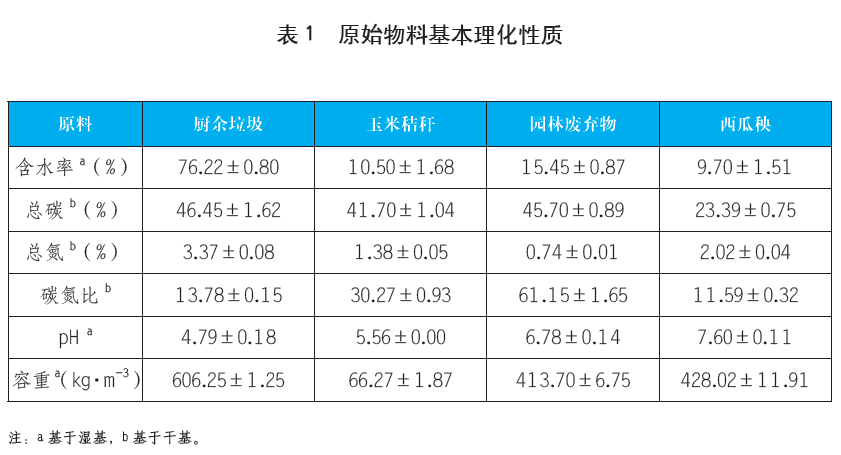 本試驗以分類后廚余垃圾為原料,以粒徑控制在40~50mm以下的玉米秸稈(CS)、園林剪枝(GP)和西瓜秧(WS)按一定比例混合后,作為輔料加入到廚余垃圾中進行堆肥。其中廚余垃圾主要含有60.79%菜葉、8.96%剩飯、19.31%果皮、3.68%蛋殼、1.97%骨頭以及5.29%其他物質(以濕重計),主要分布在<30mm粒徑段,其次為>80mm和50~60mm的較大粒徑段,其他粒徑段含量較少。堆肥原料的理化性質如表1所示。