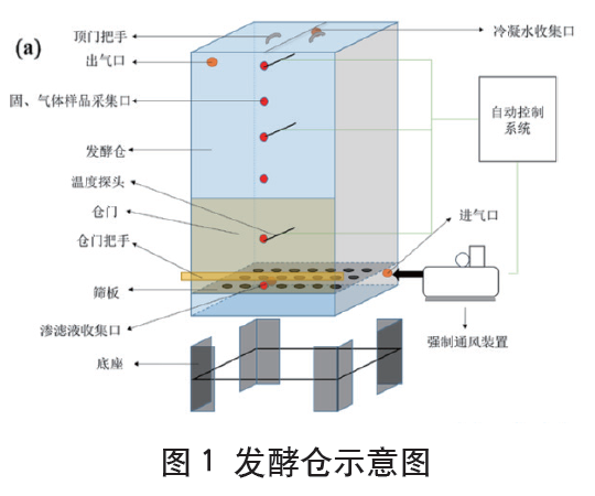 本研究采用模擬隧道發(fā)酵倉堆肥高度的中試密閉堆肥倉(1m×1m×3.5m)中進行廚余垃圾堆肥試驗。堆肥倉配備了上、中、下三個溫度探頭,自動控制系統(tǒng)連接溫度傳感器和通風裝置,以實現(xiàn)溫度記錄和通風控制,堆肥倉示意圖如圖1所示。本試驗根據(jù)所添加的三輔料(其中CS:GP:WS=1:1:1)比例不同,共設置5個處理過程,分別添加5%(T1)、10%(T2)、12.5%(T3)、15%(T4)和20%(T5)三輔料。此外,為緩解餐廚垃圾酸化導致升溫緩慢的問題,堆肥中添加了1%(以干重計)的生石灰。整個堆肥周期設為20天,其中第1~10天為高溫發(fā)酵階段,通風速率為0.05~0.15m3/m3·min;第10~20天為后熟化階段,通風速率為0.02m3/m3·min。在堆肥開始后第0、2、6、10、20天,在發(fā)酵倉的上、中、下三點每次分別采集約300g固體樣品用于后續(xù)指標的測定。