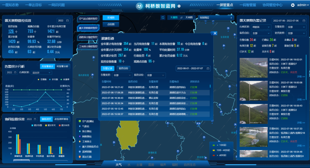 露天焚燒管控一直是大氣環(huán)境治理的一個(gè)共性難題,秸稈焚燒、垃圾焚燒等現(xiàn)象屢見不鮮。2021年,紹興市柯橋區(qū)露天焚燒發(fā)生率偏高且覆蓋全區(qū),總體呈現(xiàn)“面域廣、點(diǎn)源小、易多發(fā)、發(fā)現(xiàn)難、處置難”等痛點(diǎn),露天焚燒對全區(qū)空氣環(huán)境質(zhì)量產(chǎn)生較大影響。為此,柯橋區(qū)按照省數(shù)字化改革關(guān)于推動“1612”體系和“141”體系全貫通工作要求,打造多跨協(xié)同應(yīng)用場景“柯橋區(qū)露天禁燒精密智控”應(yīng)用,對原先高空瞭望露天禁燒預(yù)警監(jiān)測平臺進(jìn)行迭代升級,在高效預(yù)警、處置閉環(huán)、智能可視、數(shù)據(jù)分析等功能上進(jìn)行優(yōu)化升級,打通聯(lián)動執(zhí)法新通道,重塑“四員一線雙閉環(huán)”告警閉環(huán)機(jī)制、“兩查清一到位”管控處置機(jī)制、露天禁燒督查考核等制度,構(gòu)建極速預(yù)警、迅速派單、快速處置、定速反饋的閉環(huán)全流程。在2個(gè)街道率先進(jìn)行試點(diǎn),今年4月底已在全區(qū)所有鎮(zhèn)街進(jìn)行推廣。截至5月31日,柯橋區(qū)露天禁燒告警數(shù)共1012起,較去年同期減少423起,同比下降30%;平均處置時(shí)間為29.8分鐘,與去年同期縮短12.5分鐘,同比降低30%。