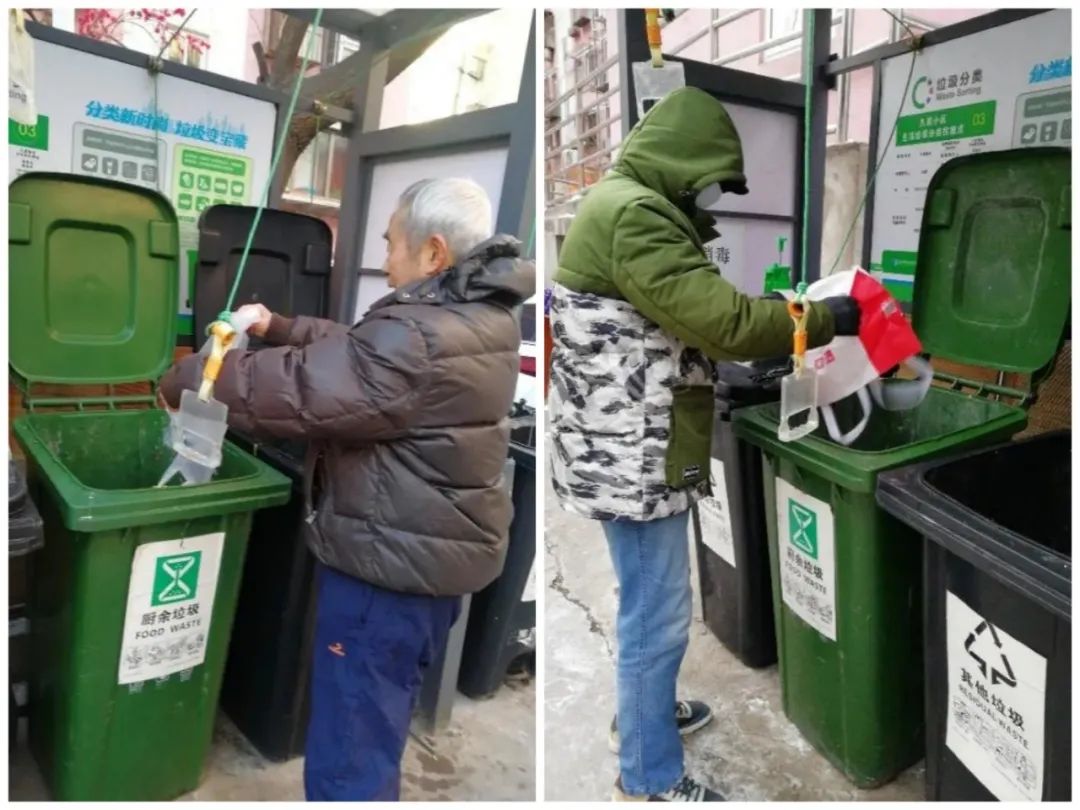 圖10 北京市石景山區(qū)久筑社區(qū)居民在破袋投放廚余垃圾,拍攝:光明之子_1097570,拍攝時間:2022年2月4日(左)、2022年2月15日(右)