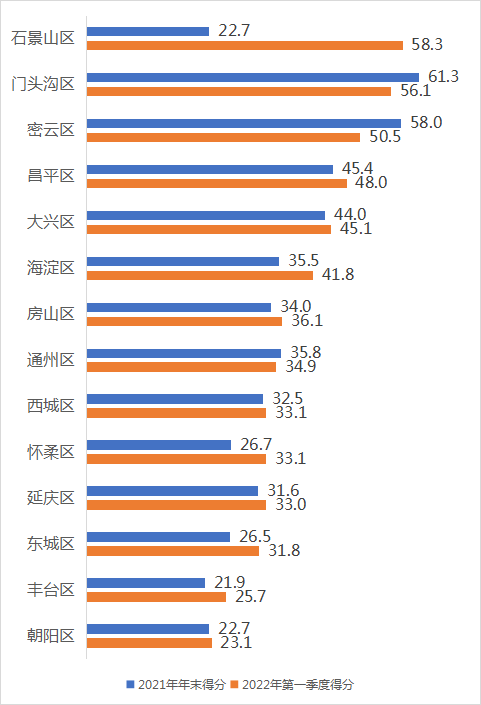 納入本期指數(shù)計算的北京市隨手拍共4235條,覆蓋十六個區(qū)3611個小區(qū),去除覆蓋度不足0.05%的順義區(qū)和平谷區(qū),十四區(qū)中得分最高的是石景山區(qū),58.3分,朝陽區(qū)最低,23.1分,全市各區(qū)平均分39.3.,城六區(qū)平均分35.6分。和2021年年末相比,各區(qū)平均分上升了3.7分,城六區(qū)平均分上升了8.7分。14個區(qū)的得分有所增長,其中石景山區(qū)增幅最大,得益于1月以來石景山區(qū)為迎接2022年冬奧會、冬殘奧會,區(qū)城管委推進的監(jiān)督管理智能化、推進引導宣傳精細化、推進社會參與常態(tài)化等舉措。圖 21 北京市11區(qū)2022年第一季度垃圾分類指數(shù)得分