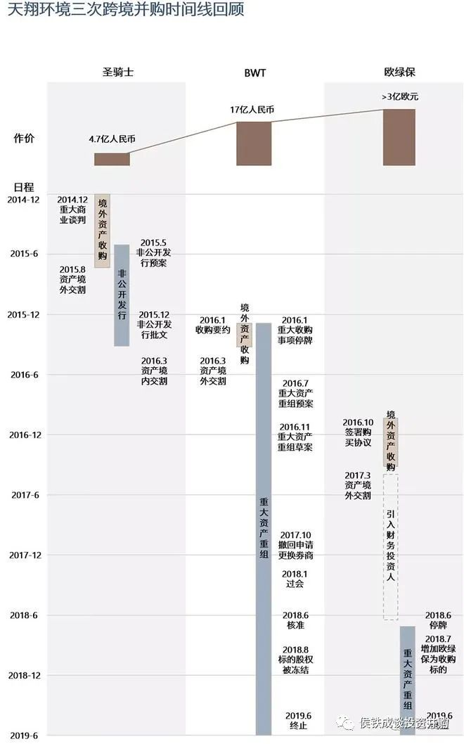 原本的十大并購案例,寫著寫著寫成了十大環(huán)保并購慘案。為了緩解大家失落悵惘的心情,免費奉上一個跌到谷底的案子,大家再忍一忍,黎明前的黑暗。本文為環(huán)保十大并購案例之五,天翔環(huán)境海外收購圣騎士、BWT、歐綠保,最終公司破產(chǎn)退市。我們之前看的幾個并購失敗案例,雖然也都是十年苦心經(jīng)營,毀于一旦,但大部分只是元氣大傷,主營業(yè)務(wù)利潤虧光,大股東黯然離場而已。今天的案例,并購的后果是上市公司破產(chǎn)退市,大股東債務(wù)纏身被檢查機關(guān)起訴,員工債權(quán)人均蒙受巨大損失。里里外外大幾十億的虧損,堪稱“環(huán)保上市公司十年內(nèi)最大的慘案”。歡迎大家多提寶貴意見。尋找底層規(guī)律,帶動行業(yè)發(fā)展,避免低級錯誤重現(xiàn)。幾經(jīng)掙扎的天翔環(huán)境最終還是在2021年8月30日迎來了被深交所摘牌的結(jié)局。天翔環(huán)境原名天保重裝,原主業(yè)為大型節(jié)能環(huán)保及清潔能源設(shè)備,具體包括分離機械系列設(shè)備和水輪發(fā)電機組設(shè)備,并于2014年完成上市。當(dāng)時,天翔環(huán)境的主營已露疲態(tài),上市當(dāng)年收入下滑超過30%,公司開始尋找轉(zhuǎn)型方向。2015年開始,天翔環(huán)境通過連續(xù)的大手筆并購進(jìn)軍環(huán)保領(lǐng)域,先后以4.7億收購美國的污泥處理設(shè)備公司圣騎士、17億收購德國的水處理公司BWT,并在隨后迎來了自己的高光時刻,2016年底,其市值來到了107.5億的歷史最高值。好景不長,因為體外并購未能裝入上市公司,導(dǎo)致了一系列問題,悲劇大幕就此拉開。2018年,天翔環(huán)境在年報中披露,控股股東直接控制的成都親華科技有限公司非經(jīng)營性資金占用24.55億,而當(dāng)時天翔環(huán)境本身的債務(wù)逾期金額已達(dá)到17.58億。從此,天翔環(huán)境股價持續(xù)下跌,直至2021年8月30日最終被深交所摘牌。回顧天翔環(huán)境的發(fā)展歷程,核心是三次海外收購,分別是2014年12月收購的美國圣騎士,2016年1月收購的BWT公司,2016年10月收購的歐綠保,交易金額預(yù)期超過3億歐元。其中第一個交易順利完成,后面兩個交易只完成了體外收購,并沒有完成裝入上市公司的動作,最終也導(dǎo)致了上市公司與大股東的相繼崩盤。第一筆收購,公司與券商聯(lián)合成立基金,收購標(biāo)的公司。然后上市公司非定向增發(fā),募集資金收購基金持股。收購與定增并行推進(jìn),加快交易節(jié)奏,順利地完成了交易。這個案子金額相對小,方案謹(jǐn)慎,交易結(jié)構(gòu)簡單,資本市場當(dāng)時資金充足,因此完成相對容易些。企業(yè)由此嘗到了甜頭,默認(rèn)為其他項目也可以先收購,再定增裝入上市公司。2016年2月,僅僅在上市公司剛剛完成非公開發(fā)行一個月、圣騎士股權(quán)尚未完成交割之時,天翔環(huán)境又再次啟動了對更大的收購標(biāo)的——估值達(dá)到2.2億歐元的德國水處理公司BWT。因為交易時間緊張,天翔和基金先籌集資金收購,然后再由大股東組建資金替代基金,大股東向其他人承諾兜底,最終由上市公司定增完成收購。在當(dāng)時的背景下,是有很多基金愿意參與并購定增,同時也默認(rèn)定增即可賺錢的邏輯,愿意參與這種有一定風(fēng)險的投資。基金的收益在于定增后的股價增值,以及定增不成的大股東保底,風(fēng)險在于定增后股價下跌,定增失敗后大股東無法保底。當(dāng)時環(huán)境下,基金方總體上還是認(rèn)為風(fēng)險收益匹配的。這種情況跟當(dāng)時的熱錢有關(guān),即大部分資金來自信托,錢多無處可投。當(dāng)時的資金投資邏輯并不穩(wěn)定,是一種特殊情況。但第二筆收購出現(xiàn)了問題,監(jiān)管機構(gòu)審核達(dá)2年之久。兩個原因,一個是券商的原因,一個是資金的來源問題。最終獲得批文的時間已經(jīng)是2018年6月。雪上加霜的是,公司在這筆交易尚未完成之際,大股東又組團(tuán)以3億歐元的價格收購了更大的一家歐洲垃圾處理公司,同樣無法完成交易。這個時候大股東和上市公司都扛不住了,體外并購的杠桿利息,疊加當(dāng)時嚴(yán)厲“去杠桿”的外部環(huán)境以及上市公司的PPP業(yè)務(wù)占用大量資金無法回收,跌跌不休的股價最終帶崩了大股東以及上市公司的債務(wù)崩盤。2018年8月,大股東企業(yè)親華科技持有中德天翔20.59%的股份被債權(quán)人凍結(jié),導(dǎo)致上市公司收購中德天翔的交易無法完成交割。2019年1月24日上市公司公告收到證監(jiān)會立案調(diào)查通知書,此時天翔環(huán)境大股東因債務(wù)危機侵占上市公司資金已經(jīng)公開。2019年6月19日,天翔環(huán)境公告終止收購中德天翔以及歐綠保的交易,大股東的過橋基金退出失敗,天翔環(huán)境開始自由解體。公司2021年年報披露,在2020年8月收到鄧親華及一致行動人鄧翔提供的成都市公安局出具 的《取保候?qū)彌Q定書》,2021年1月19日,公司、鄧親華、鄧翔被移送成都市人民檢察院審查起訴。整個故事中,公眾號“文藝馥欣”做了精彩的分析和點評,上述配圖和部分?jǐn)⑹鰜碓从谄涔娞栁恼拢哪┯邢嚓P(guān)鏈接。本案整個過程也比較清晰,公司上市后謀求發(fā)展轉(zhuǎn)型,先定增10億人民幣,發(fā)行收購了美國圣騎士公司,然后打算采用收購美國圣騎士公司的操作,體外收購德國