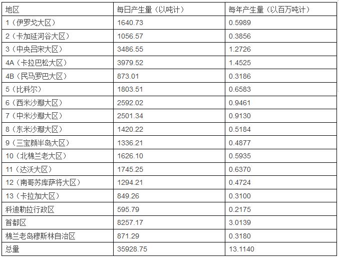 下方的圖表展示的是菲律賓全國(guó)各地區(qū)的廢物產(chǎn)生量,數(shù)據(jù)的來(lái)源是國(guó)家固廢管理委員會(huì)秘書(shū)處。數(shù)據(jù)是通過(guò)計(jì)算各地區(qū)人均廢物產(chǎn)生量和人口的乘積得到的。平均來(lái)說(shuō),在城市區(qū)域和農(nóng)村區(qū)域,人均廢物產(chǎn)生量分別為0.5kg/天和0.3千克/天。在首都區(qū),也就是馬尼拉大都市區(qū)的所在地,人均廢物產(chǎn)生量最高,為0.71千克/人/天。