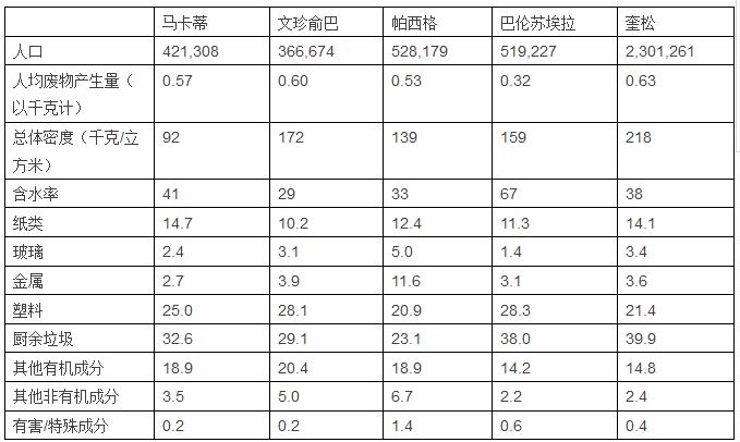 可以看出,在每座城市中,廚余垃圾以及其他的有機(jī)廢物都占到了廢物總產(chǎn)生量的大約50%。可循環(huán)利用的成分占到了42-49%,其中塑料占總量的21-28%。其他非有機(jī)成分和特殊成分則分別占到了2-6%和0.2-1.4%。