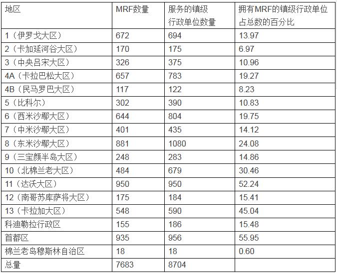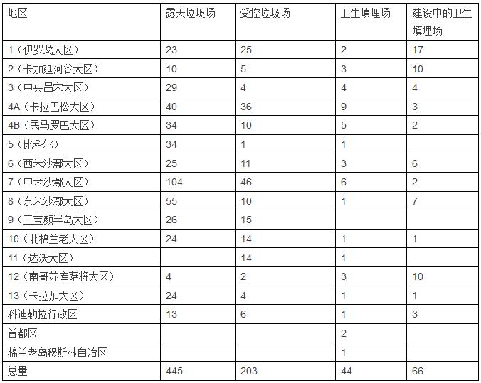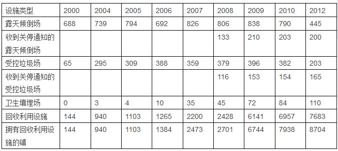 2012年時(shí),菲律賓全國(guó)有7683個(gè)回收利用設(shè)施,滿足了8704個(gè)鎮(zhèn)的需求。下表列出了菲律賓全國(guó)回收利用設(shè)施的狀況。