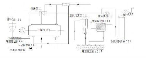 如圖1 ,污泥的蒸汽熱干化技術(shù)采用以工 業(yè)蒸汽為干燥介質(zhì),通過污泥干燥機(jī)將含水率 為7 0 % 的污泥經(jīng)螺旋輸送機(jī)(M01 )送達(dá)污泥 干燥機(jī)(ES1),來自工業(yè)用中壓蒸汽將乏氣(由 污泥干后形成的廢氣)加熱至110℃,送入干燥 機(jī)(E S 1 )的入口,與入口污泥進(jìn)行混合預(yù)熱, 同時,在干燥機(jī)(ES1)筒體外殼內(nèi)通入工業(yè)用 中壓蒸汽,作為污泥干燥的主要熱源,采用與 污泥逆流換熱的方式進(jìn)行熱量傳導(dǎo),干燥后的 污泥與干燥過程中產(chǎn)生的乏氣一起進(jìn)入旋風(fēng)分 離器(C 1 ),其中9 5 % 以上的干燥污泥在旋風(fēng) 分離器(C 1 )中被分離,另外5 % 的污泥與乏 氣在布袋除塵器(F T 1 )中被收集,并共同進(jìn) 入螺旋輸送AC1 輸送出系統(tǒng);被分離出的乏氣, 一部分(約20%)進(jìn)入下一輪污泥干燥循環(huán),另 一部分(約80%)通過活性炭吸附器(CO1)除臭后排入大氣。