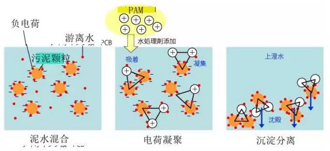 從上圖可以看到,生活污水處理廠的污泥中的污泥顆粒帶有負(fù)電荷(工業(yè)廢水中污泥顆粒會(huì)攜帶正電荷),在水中發(fā)生同性相斥作用,導(dǎo)致污泥無(wú)法凝聚到一起,在投入陽(yáng)離子的PAM藥劑以后,PAM藥劑帶有與污泥顆粒攜帶的電荷相反的電荷,通過(guò)這些電荷的異性相吸作用,把污泥顆粒吸附凝集到一起,把成懸浮狀態(tài)的污泥顆粒變成更大體積的污泥顆粒,這些依靠化學(xué)作用凝聚到一起的污泥顆粒由于比重遠(yuǎn)遠(yuǎn)大于水,所以很容易在水中沉淀下來(lái)。