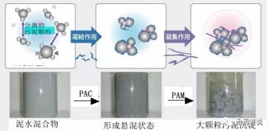 那么什么樣的化學(xué)藥劑可以作用到污泥中這些因素,并能夠?qū)崿F(xiàn)污泥中水分的去除呢?我們來(lái)了解一種化學(xué)藥劑,學(xué)名為聚丙烯酰胺,化學(xué)名稱的縮寫為PAM。PAM作為一種聚合藥劑,在水處理中的應(yīng)用廣泛,主要是對(duì)泥水混合物進(jìn)行有效的固液分離,從而實(shí)現(xiàn)污泥脫水的化學(xué)凝聚作用。對(duì)于PAM的制作和特性,在很多文獻(xiàn)中都有,不作為今天主要討論的內(nèi)容。今天就是來(lái)看PAM是怎樣實(shí)現(xiàn)對(duì)泥水混合物的固液分離的,我們來(lái)看看這一張圖。