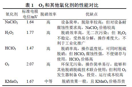 近幾年,關(guān)于O3氧化結(jié)合堿液吸收的新技術(shù)越來越多,MING等[34]開展了O3氧化與NaOH溶液吸收耦合的同時脫硫脫硝技術(shù)研究;SUN等[35]利用堿性的氧化鎂漿料作為吸收劑,研究了O3氧化協(xié)同氧化鎂漿液吸收的同時脫硫脫硝新工藝。O3可以很好地的和不同吸收劑及其他技術(shù)協(xié)調(diào)使用,擁有很強的使用靈活性,這為其應(yīng)用推廣提供了便利,O3氧化法應(yīng)用的關(guān)鍵在于如何降低O3的制取成本。O3和其他氧化劑的性能對比見表1。