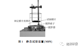膜片處理:將大片(張)膜用除鹽水潤濕透水側(cè),輕輕地平整固定在玻璃板上,使用特制的裁剪裝置(一端軟固定、一端鋒利刀片)將膜裁剪成需要的尺寸,切忌刮傷膜片或重壓膜片。將裁剪好的膜片在滅菌的除鹽水中浸泡24h,其間換水3次。靜態(tài)試驗的膜片需要事先固定在支撐的圓環(huán)上,再進行滅菌處理。試驗菌液(中水中微生物菌種)培養(yǎng)和配制:取中水放于事先經(jīng)過滅菌處理的潔凈燒杯中;取2個已經(jīng)殺菌的培養(yǎng)皿,利用移液管從燒杯中分別取1mL中水置于培養(yǎng)皿中。用潔凈燒杯稱取牛肉膏0.5g,蛋白胨1g,氯化鈉0.5g,瓊脂2g,加除鹽水溶于100mL錐形瓶中,攪拌并調(diào)節(jié)pH 至7.2~7.4,塞緊瓶口,放于滅菌鍋中滅菌,4h后,取出錐形瓶冷卻至50℃左右,倒入培養(yǎng)皿,以剛好覆蓋培養(yǎng)皿底部為宜;蓋好培養(yǎng)皿,置于37℃恒溫箱中培養(yǎng)24h;24h后,取出培養(yǎng)皿,用玻璃棒挑出菌落置于裝有除鹽水的燒杯中,攪拌待用。