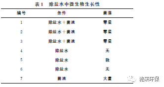 2.1反滲透產(chǎn)品水(即除鹽水)中微生物生長性研究:取6個500mL的事先滅菌處理的潔凈燒杯,分別加入200mL的除鹽水;在1、2、3號燒杯中分別加入1mL配置的菌液;將6個燒杯上口蓋緊,置于室溫下靜置,5h后分別取1mL水樣培養(yǎng),觀察培養(yǎng)皿表面菌落生長情況;同時另取一個培養(yǎng)皿(7號),取1mL原菌液模擬中水條件,進行對比培養(yǎng)。試驗結(jié)果見表1。