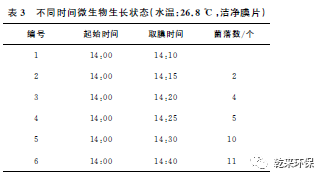 2.3.1微生物污染出現(xiàn)時間試驗分別取6個潔凈的500mL燒杯,編號后,分別加入200mL除鹽水和1mL培養(yǎng)菌液,靜置30min;同時向6個燒杯中加入2片潔凈RO膜片,開始計時,以65r/min轉(zhuǎn)速攪拌,分別在10、15、20、25、30、40min后,取出膜片,用清洗液清洗,再取其中的1mL清洗液進行微生物培養(yǎng); 觀察6個培養(yǎng)皿中的微生物生長情況。試驗結(jié)果見表3。