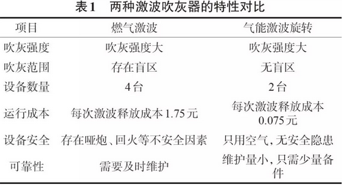 考慮到該廠蒸發(fā)器有鰭片管,擔心聲波的效果弱;而蒸汽吹灰故障率太高,效果也不理想,所以將該方案排除掉。最后對燃氣激波和氣能激波旋轉(zhuǎn)方案進行詳細對比分析,見表1。