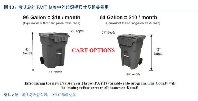 PAYT制度通常下的定價(jià)模式有全單位定價(jià)模式、部分單位定價(jià)及浮動(dòng)定價(jià)等三種模式。以全單位定價(jià)的PAYT模式為例,居民首先需要購買由當(dāng)?shù)卣y(tǒng)一印刷的標(biāo)牌,并將標(biāo)牌粘貼到一定容量的垃圾袋上;或者根據(jù)自己產(chǎn)生垃圾量大小向政府申請垃圾桶,政府根據(jù)垃圾桶大小而收費(fèi)。以夏威夷州的考艾島為例,該地區(qū)在2015年7月開始實(shí)行PAYT制度,居民可以選擇兩種尺寸的垃圾桶,一種是96加侖的垃圾桶,每月需付費(fèi)18美元,一種是64加侖的垃圾桶,每月需付費(fèi)10美元,一個(gè)64加侖的車,每月10美元。