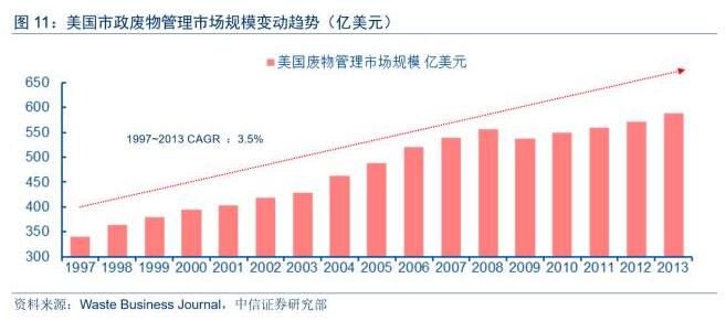 根據(jù)WasteBusinessJournal統(tǒng)計(jì),美國市政廢物管理市場規(guī)模自1997年的341億美元持續(xù)攀升至2013年的589億美元,期間復(fù)合增速為3.5%,高于同期人口增速和廢物產(chǎn)生量增速。受金融危機(jī)影響,市場規(guī)模自2008年的55.7億元略微下滑至2009年的53.7億元,但在2011年即恢復(fù)至金融危機(jī)前的水平。