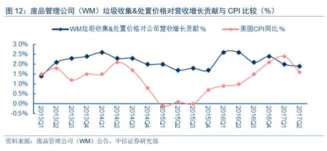 類似廢品管理(WM)這類的大型市政廢物管理公司在提升前端的收集&轉(zhuǎn)運(yùn)收費(fèi)標(biāo)準(zhǔn)的同時(shí),也同時(shí)相應(yīng)提高填埋業(yè)務(wù)對外收費(fèi)標(biāo)準(zhǔn),進(jìn)而影響前端中小型環(huán)衛(wèi)公司的成本結(jié)構(gòu),推動(dòng)中小型環(huán)衛(wèi)公司跟進(jìn)提升收集&轉(zhuǎn)運(yùn)價(jià)格。因此,在和上游客戶的博弈過程中,高度集中和前后端打通的市場結(jié)構(gòu)使得競爭對手不能通過不提價(jià)戰(zhàn)略而搶占龍頭企業(yè)的環(huán)衛(wèi)市場份額,并最終形成全行業(yè)廢物收集及處置價(jià)格的持續(xù)性上漲。由此可見,在市場高度集中及龍頭打通產(chǎn)業(yè)鏈的市場結(jié)構(gòu)下,小幅高于CPI的溫和性價(jià)格上漲模式具有非常高的持續(xù)性,最終推動(dòng)行業(yè)規(guī)模持續(xù)穩(wěn)健上升。