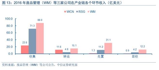 美國環(huán)衛(wèi)市場為典型的一體化模式,相關(guān)企業(yè)在大力參與前端收集&轉(zhuǎn)運(yùn)業(yè)務(wù)同時(shí),后端處置及資源回收領(lǐng)域也積極布局和參與,以充分發(fā)揮協(xié)同和提升公司競爭優(yōu)勢。從廢品管理(WM)等三家全國性市政廢物管理公司的2016年收入構(gòu)成看,收集&轉(zhuǎn)運(yùn)業(yè)務(wù)收入分別占到三家公司2016年內(nèi)部抵消前總營業(yè)收入的63%、75%和94%,后端處置分別站到合并抵消前營業(yè)收入的19%、19%和4%。