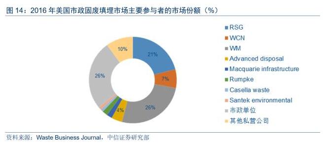 廢品管理(WM)等美國三大環(huán)衛(wèi)龍頭公司除在前端收集及轉(zhuǎn)運(yùn)已經(jīng)牢牢樹立壟斷地位外,多年來通過在后端處置環(huán)節(jié)的持續(xù)大力參與,目前在填埋環(huán)節(jié)的領(lǐng)先優(yōu)勢也異常明顯。2016年,三大環(huán)衛(wèi)公司在填埋市場份額占比合計(jì)高達(dá)54%,WM、RSG及WCN在市政廢物總填埋量中占比分別為26%、21%、7%,填埋市場的寡頭壟斷特征突出。