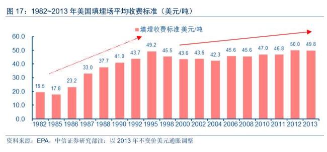 美國市政廢物的填埋平均價(jià)格自1985年的17.8美元/噸上升至1995年的49.2美元/噸,10年間價(jià)格漲幅接近3倍,收費(fèi)上漲的主要原因是監(jiān)管加嚴(yán)和標(biāo)準(zhǔn)提升帶動(dòng)填埋場的建造和運(yùn)營成本上升明顯,此階段是典型的成本拉動(dòng)型價(jià)格上漲。在2000年之后,廢物填埋收費(fèi)呈現(xiàn)溫和且持續(xù)的上漲,自2000年的43.6美元/噸溫和上漲至2013年39.8美元/噸,2000~2013年價(jià)格復(fù)合增速為1.1%,通脹及寡頭壟斷的市場結(jié)構(gòu)是該階段價(jià)格上漲的重要推動(dòng)力。