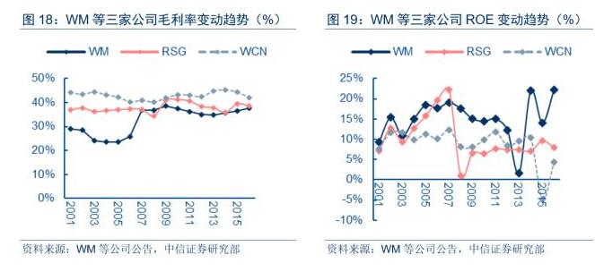 美國環(huán)衛(wèi)龍頭公司的毛利率及凈資產(chǎn)收益率(ROE)等財(cái)務(wù)指標(biāo)持續(xù)表現(xiàn)突出。在2007~2016年的過去10年中,廢品管理(WM)、共和服務(wù)(RSG)、廢物聯(lián)合公司(WCN)的毛利率全部維持在35%之上,其中廢物聯(lián)合公司(WCN)長期維持在40%之上。從凈資產(chǎn)收益率看,上述三家公司的凈資產(chǎn)收益率過去10年的均值分別為15%、8%和8%,其中廢品管理公司的凈資產(chǎn)收益率顯著超出其他兩家公司,主要是因?yàn)橄啾葍蓚€(gè)競爭對手,公司擁有更高的資產(chǎn)周轉(zhuǎn)率和財(cái)務(wù)杠桿。