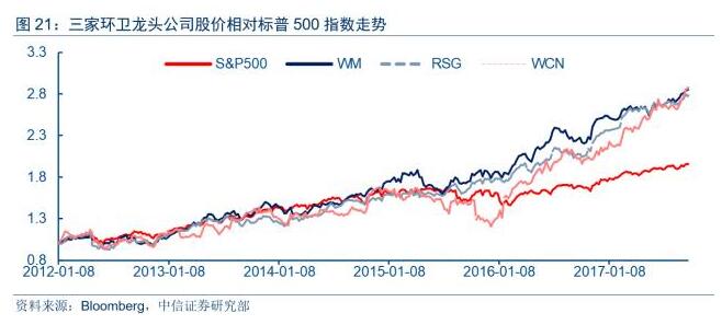 高股息率、不依賴外部融資和突出的定價(jià)能力對投資具有較強(qiáng)吸引力。從公司股價(jià)相對標(biāo)普指數(shù)走勢看,三家環(huán)衛(wèi)龍頭股價(jià)均顯跑贏標(biāo)普500指數(shù),具有較明顯的相對收益。