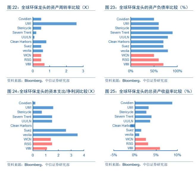 為厘清環(huán)衛(wèi)公司的商業(yè)模式為輕資產(chǎn)還是重資產(chǎn),我們選取了總資產(chǎn)收益率(ROA)、資產(chǎn)周轉(zhuǎn)率、資產(chǎn)負(fù)債率、資本支出/凈利率等4個(gè)財(cái)務(wù)指標(biāo),將廢品管理(WM)等3家美國環(huán)衛(wèi)公司的財(cái)務(wù)比率與國際上的水務(wù)、固廢、危廢領(lǐng)域代表公司進(jìn)行對比,可以看出美國環(huán)衛(wèi)公司的資產(chǎn)周轉(zhuǎn)率和資產(chǎn)負(fù)債率處于行業(yè)平均水平,資本支出/凈利潤略低于行業(yè)平均,由此可見美國環(huán)衛(wèi)公司的重資產(chǎn)特征突出。以資產(chǎn)周轉(zhuǎn)率為例,2016年,廢品管理(WM)、共和服務(wù)(RSG)、廢物聯(lián)合公司(WCN)三家公司的資產(chǎn)周轉(zhuǎn)率分別為0.7x、0.5x、0.5x,和蘇伊士、威立雅的0.5x、0.6x基本接近。
