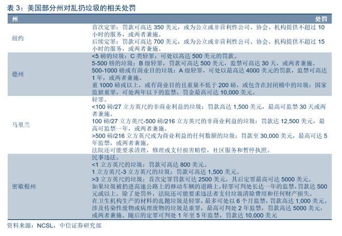 目前在美國,道路清掃業(yè)務(wù)市場規(guī)模相比清運(yùn)和清理而言幾乎可以忽略不計(jì),主要原因是美國道路清掃需求較低,這和國內(nèi)環(huán)衛(wèi)市場以清掃為主的現(xiàn)狀存在顯著差異。美國亂扔垃圾是一種犯罪行為,50個(gè)州均制定禁止亂扔垃圾的法律,罰款范圍從科羅拉多州的20美元到馬里蘭州的30,000美元,且在更嚴(yán)重情況下會(huì)處以監(jiān)禁,比如說在愛達(dá)荷州的刑期為10天,在田納西州高達(dá)6年。對亂扔垃圾嚴(yán)格立法導(dǎo)致美國道路較為整潔,大多數(shù)城市的道路清掃頻率為每周一次,部分城市甚至每個(gè)月做一次道路清掃,道路清掃的需求非常低,相應(yīng)導(dǎo)致清掃業(yè)務(wù)市場規(guī)模比較小。