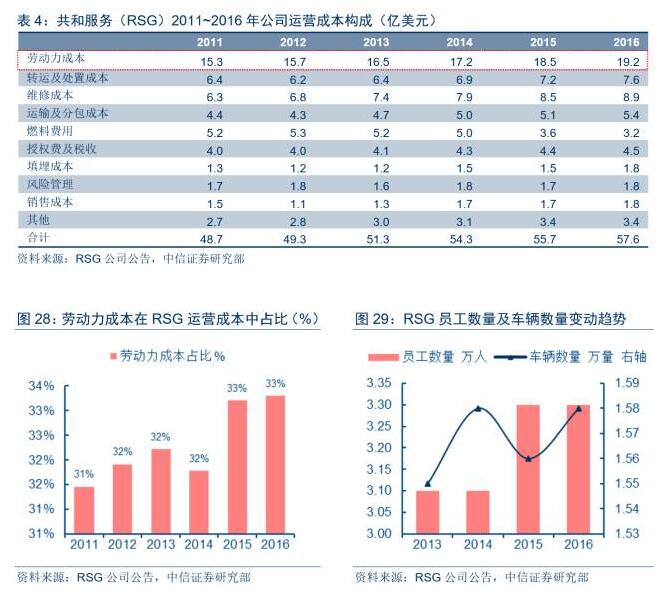 美國生活垃圾的清掃與收集基本實(shí)現(xiàn)完全機(jī)械化,由居民先行實(shí)施垃圾分類處理,環(huán)衛(wèi)工人直接通過駕駛特制裝載車收集社區(qū)住戶附近垃圾桶內(nèi)的廢棄物,然后將市政廢物運(yùn)往垃圾轉(zhuǎn)運(yùn)中心或者最終處理設(shè)施。以共和服務(wù)(RSG)為例,從員工數(shù)量和公司機(jī)械設(shè)備數(shù)量看,RSG的員工數(shù)量和車輛數(shù)量大體維持在2:1的水平;在2011~2016年公司運(yùn)營成本構(gòu)成中,勞動(dòng)力成本在公司運(yùn)營成本占比穩(wěn)定維持在31%~33%的區(qū)間內(nèi),顯著低于國內(nèi)環(huán)衛(wèi)市場中的勞動(dòng)力成本占比。由此可見,通過持續(xù)不斷的機(jī)械化替代,廢物管理市場各參與方的勞動(dòng)力成本規(guī)模和占比確實(shí)可以實(shí)現(xiàn)有效控制。