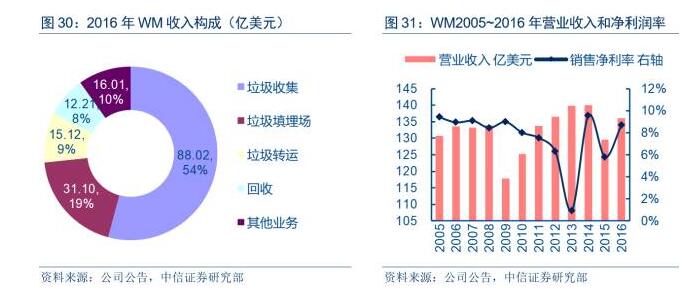 廢品管理(WM)是北美規(guī)模最大固廢處理公司,目前共擁有2.2萬輛垃圾收集車輛,4.12萬名員工,262個(gè)填埋場,310個(gè)固廢中轉(zhuǎn)站,120家資源回收中心和17家垃圾焚燒發(fā)電廠,服務(wù)美國、加拿大和波多黎各等2,700萬戶工商業(yè)和居民客戶。2016年,公司營收規(guī)模為136.09億美元,凈利潤為11.82億美元,目前市值約330億美元,是標(biāo)普500指數(shù)成分股。