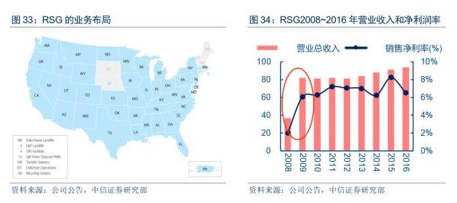 1981年,公司前身RepublicIndustry作為垃圾處理公司成立;1998年,RepublicIndustry將共和國服務(wù)公司(RSG)分拆上市;2008年6月,RSG以61億美元的股票收購其較大的競爭對手AlliedWasteIndustries,一舉成為美國第二大廢物管理公司。大體量并購?fù)苿?dòng)公司營業(yè)收入從2008年的36.85億美元上升到2009年的81.99億美元,同比上升122.49%;凈利潤從2008年的0.74億美元上升到2009年的4.95億美元,同比上升570.73%。