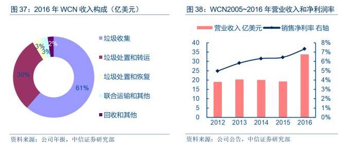 從收入規(guī)模看,廢物聯(lián)合公司(WCN)是北美第三大固體廢物服務(wù)公司,也是北美領(lǐng)先的油田廢物處理公司,在美國和加拿大提供垃圾收集、轉(zhuǎn)運(yùn)、處置和回收服務(wù)。截至2016年末,公司經(jīng)營261個(gè)固體廢物收集操作網(wǎng)絡(luò),135個(gè)轉(zhuǎn)運(yùn)站,7個(gè)聯(lián)運(yùn)設(shè)施,71個(gè)回收中心,93個(gè)垃圾填埋場,22個(gè)E&P液體廢物注入井和17個(gè)E&P廢物處理和采油設(shè)施。客戶涵蓋美國40個(gè)州和加拿大5個(gè)省份的住宅、商業(yè)、工業(yè)和E&P客戶。2016年公司實(shí)現(xiàn)營業(yè)收入33.76億美元,凈利潤2.47億美元。