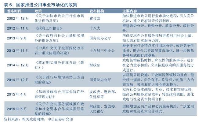 近年來,國家出臺(tái)一系列相關(guān)政策,構(gòu)建公用事業(yè)市場化框架。一是推進(jìn)政企分開、政事分開,簡政放權(quán);二是加快推進(jìn)市政公用事業(yè)的市場化進(jìn)程,引入競爭機(jī)制,推廣政府和社會(huì)資本合作模式,由政府授權(quán)特許經(jīng)營,加大政府購買服務(wù)力度。在此基礎(chǔ)上,各個(gè)地方也出臺(tái)多項(xiàng)在公用事業(yè)領(lǐng)域引進(jìn)社會(huì)資本投資的政策,要求當(dāng)?shù)丨h(huán)衛(wèi)監(jiān)管部門從“管干一體”轉(zhuǎn)型為專業(yè)監(jiān)督管理組織,將環(huán)衛(wèi)服務(wù)項(xiàng)目向社會(huì)公開招投標(biāo),進(jìn)行市場化運(yùn)作,在服從管理機(jī)構(gòu)調(diào)度的前提下,自負(fù)盈虧。這一系列舉措核心是避免政府成為單一投資主體,實(shí)行政府和社會(huì)資本的合作模式,使得環(huán)衛(wèi)服務(wù)業(yè)走向市場化之路。