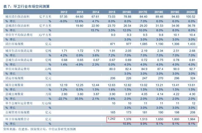 目前城市道路年清掃市場價(jià)格普遍在8~12元/平方米,假設(shè)2015年國內(nèi)清掃均價(jià)為9元平方米;清運(yùn)均價(jià)普遍在70~90元/噸,假設(shè)2015年國內(nèi)清運(yùn)均價(jià)為80元/噸;國內(nèi)公廁維護(hù)價(jià)格普遍在8~12萬區(qū)間內(nèi),假設(shè)2015年國內(nèi)公廁年維護(hù)均價(jià)為10萬元;我們假設(shè)清掃、清運(yùn)及公廁維護(hù)價(jià)格的年均漲幅為3%,和通脹水平基本接近;