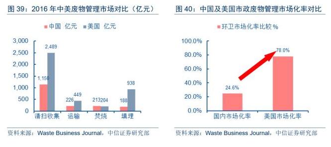 從市場規(guī)模和市場化程度的國際比較看,國內(nèi)環(huán)衛(wèi)市場擴(kuò)容潛力充分,2016年的美國市政廢物管理市場規(guī)模高達(dá)4,080億元(600億美元),是同期國內(nèi)市場規(guī)模的近3倍。對于從事環(huán)衛(wèi)業(yè)務(wù)的公司而言,除享受行業(yè)整體高單位數(shù)增長的成長擴(kuò)容潛力外,更大的成長紅利在于市場化加速推進(jìn)帶來的訂單轉(zhuǎn)移。從市場化程度看,目前美國市政廢物管理市場的市場化率為78.0%,私營企業(yè)在市場影響力和占有率等方面中擁有支配地位;而根據(jù)我們的測算,目前我國市政廢物管理市場(環(huán)衛(wèi)+最終處置)的市場化率僅為24.6%,其中我們估計(jì)環(huán)衛(wèi)的市場化率約為20%,和美國市場差距甚遠(yuǎn)?;诖?,市場化率差異蘊(yùn)含龐大的市場化加速推進(jìn)帶來的訂單轉(zhuǎn)移釋放機(jī)遇。