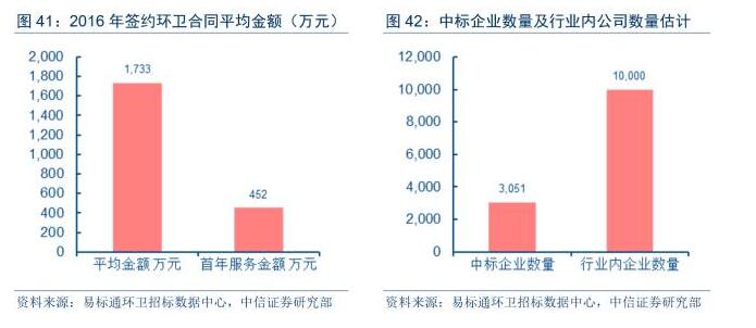 目前國內(nèi)環(huán)衛(wèi)市場參與企業(yè)數(shù)量多,合同規(guī)模小,環(huán)衛(wèi)市場高度分散。根據(jù)易標(biāo)通環(huán)衛(wèi)招標(biāo)數(shù)據(jù)中心發(fā)布的《2016年全國環(huán)衛(wèi)服務(wù)環(huán)衛(wèi)招標(biāo)市場年報(bào)》,目前全國相對活躍的環(huán)衛(wèi)企業(yè)約有10,000家左右。2016年,全國共有3,234家企業(yè)中標(biāo)環(huán)衛(wèi)項(xiàng)目,全國各地共發(fā)布環(huán)衛(wèi)招標(biāo)項(xiàng)目5,497個(gè),按照中標(biāo)企業(yè)數(shù)量計(jì)算,平均每家企業(yè)中標(biāo)項(xiàng)目數(shù)量為1.7個(gè)。此外,從合同規(guī)??矗?016年,全國各地新簽環(huán)衛(wèi)服務(wù)合同總金額為861億元,平均每個(gè)項(xiàng)目的合同金額為1,733萬元;新簽項(xiàng)目的首年服務(wù)總金額為224億元,平均每個(gè)項(xiàng)目的首年服務(wù)金額為452萬元,項(xiàng)目規(guī)模明顯偏小。
