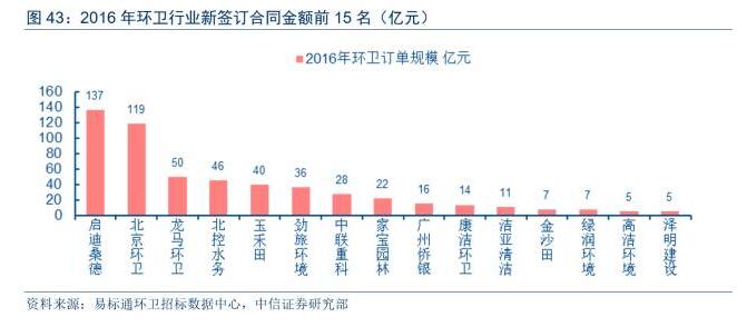 盡管參與企業(yè)眾多,但隨著資本快速進(jìn)入,龍頭企業(yè)開始快速跑馬圈地,環(huán)衛(wèi)市場訂單逐步在向具有資金&資源&管理的優(yōu)勢企業(yè)集中。根據(jù)易標(biāo)通環(huán)衛(wèi)招標(biāo)數(shù)據(jù)中心統(tǒng)計(jì)數(shù)據(jù),按照合同規(guī)模排名,2016年國內(nèi)環(huán)衛(wèi)市場簽約規(guī)模前5名企業(yè)為啟迪桑德、北京環(huán)衛(wèi)、龍馬環(huán)衛(wèi)、北控水務(wù)、玉禾田等,簽約合同規(guī)模分別為137、119、50、46、40億元。2016年前15名企業(yè)的合同簽約規(guī)模合計(jì)為542億元,占全國新簽環(huán)衛(wèi)服務(wù)合同總規(guī)模的62.9%。