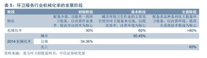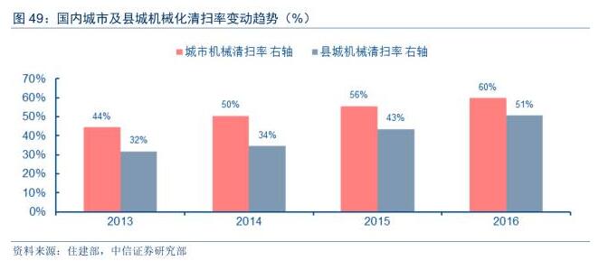 從國內(nèi)機(jī)械化率變動(dòng)趨勢看,近年來持續(xù)處于快速提升趨勢中,其中城市機(jī)械化清掃率從2013年的44%提升至2016年的60%,縣城機(jī)械化清掃率從2013年的32%提升至2016年的51%,2013~2016年平均分別提升5個(gè)及6個(gè)百分點(diǎn)。參考海外環(huán)衛(wèi)全部機(jī)械化作業(yè)的發(fā)展經(jīng)驗(yàn),國內(nèi)機(jī)械化率提升仍有較大提升空間。