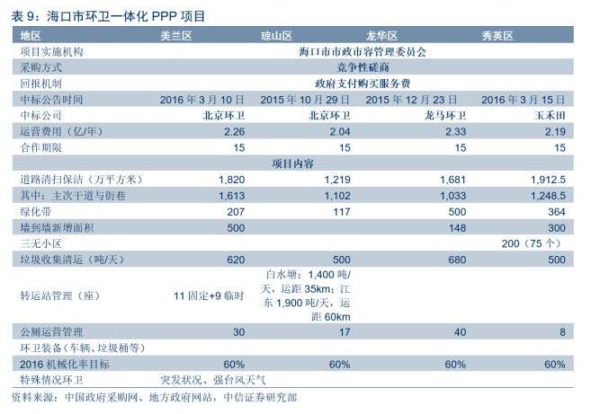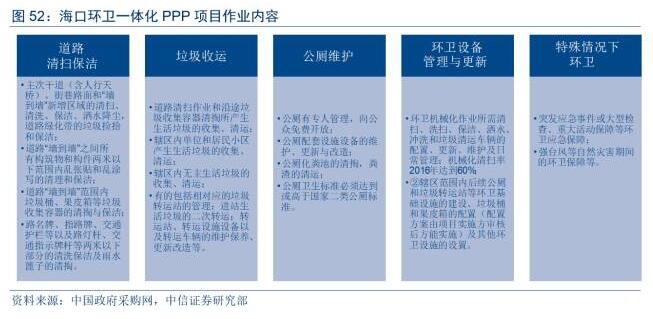 在國家及地方一系列環(huán)衛(wèi)市場化政策推動(dòng)下,環(huán)衛(wèi)服務(wù)業(yè)市場化項(xiàng)目規(guī)模迅速擴(kuò)大。目前已有許多以PPP模式運(yùn)營的環(huán)衛(wèi)項(xiàng)目完成招標(biāo)。在招標(biāo)時(shí),一種模式為環(huán)衛(wèi)一體化的整體處理項(xiàng)目,包含道路清掃、垃圾清運(yùn)、公廁維護(hù)等分項(xiàng)的項(xiàng)目;除上述模式外,將環(huán)衛(wèi)與后端垃圾焚燒發(fā)電、餐廚及污泥處置等項(xiàng)目綜合打包也開始變得頻繁起來。其中??诃h(huán)衛(wèi)一體化PPP項(xiàng)目以及固原市循環(huán)經(jīng)濟(jì)產(chǎn)業(yè)園及環(huán)衛(wèi)一體化項(xiàng)目分別為上述模式的典型案例。
