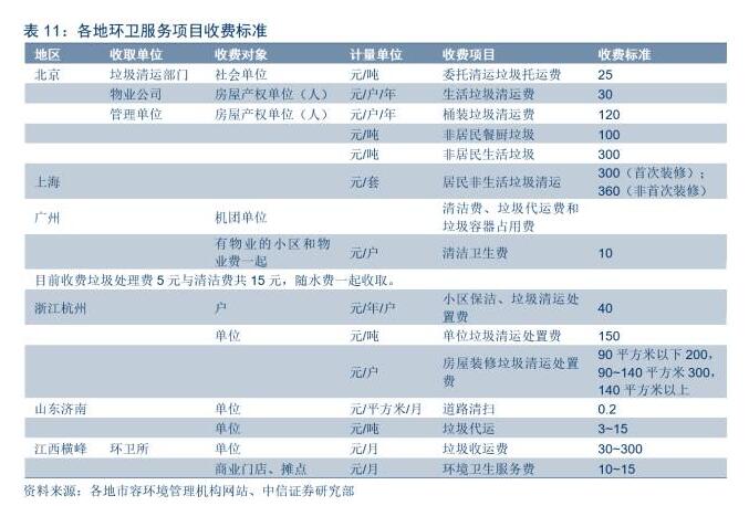 而對于垃圾清運(yùn)項(xiàng)目,部分地區(qū)沒有對此項(xiàng)進(jìn)行相關(guān)收費(fèi)規(guī)定,而僅針對從市政垃圾轉(zhuǎn)運(yùn)站到后續(xù)處理的過程收取垃圾處理費(fèi)。根據(jù)收費(fèi)對象不同以及是否為生活垃圾,收費(fèi)標(biāo)準(zhǔn)也有所不同。以北京市為例,其收取生活垃圾清運(yùn)費(fèi)標(biāo)準(zhǔn)為30元/戶/年,遠(yuǎn)遠(yuǎn)低于垃圾清運(yùn)75元/噸的市場價(jià)格,多余部分主要靠財(cái)政補(bǔ)貼為主;而且垃圾清運(yùn)費(fèi)的收取存在難度,廣州因?yàn)槎鄳羟防U費(fèi)用,考慮試行隨水費(fèi)一起征收的辦法來提高繳費(fèi)居民比例,差額部分仍需政府財(cái)政投入來保證環(huán)衛(wèi)服務(wù)項(xiàng)目正常運(yùn)轉(zhuǎn)。