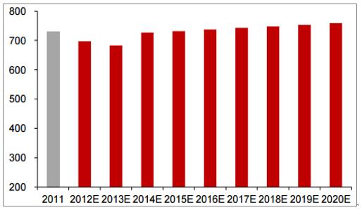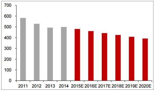 由于環(huán)保政策的更新和更加嚴格,2011年全國工業(yè)污水處理費用為1.26元/噸,根據(jù)我們預測2020年單位工業(yè)污水處理費用將達到1.94元/噸。2011年全國污水處理總量為580億噸,2011年至2014年全國工業(yè)污水總處理量成持續(xù)下降趨勢,CAGR為-3.97%。以此趨勢,我們估計2020年全國工業(yè)污水處理總量將減少至391億噸,屆時全國工業(yè)污水處理市場將達到759億元規(guī)模,由于處理成本增速大于工業(yè)污水處理總量的降幅,行業(yè)總體呈現(xiàn)逐年平穩(wěn)增加趨勢。
