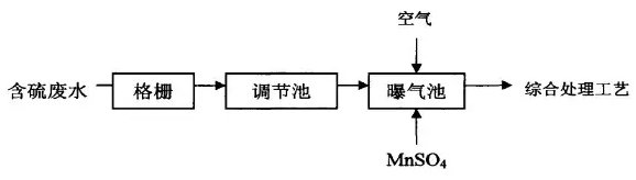 脫脂廢水通過酸處理調(diào)節(jié)PH破乳,再將破乳后的油脂經(jīng)氣浮法處理達到油水分離,污水排至綜合廢水調(diào)節(jié)池。含硫廢水可采用鐵鹽沉降法、化學混凝法、催化氧化法等,一般多使用催化氧化進行預(yù)處理,如下圖。